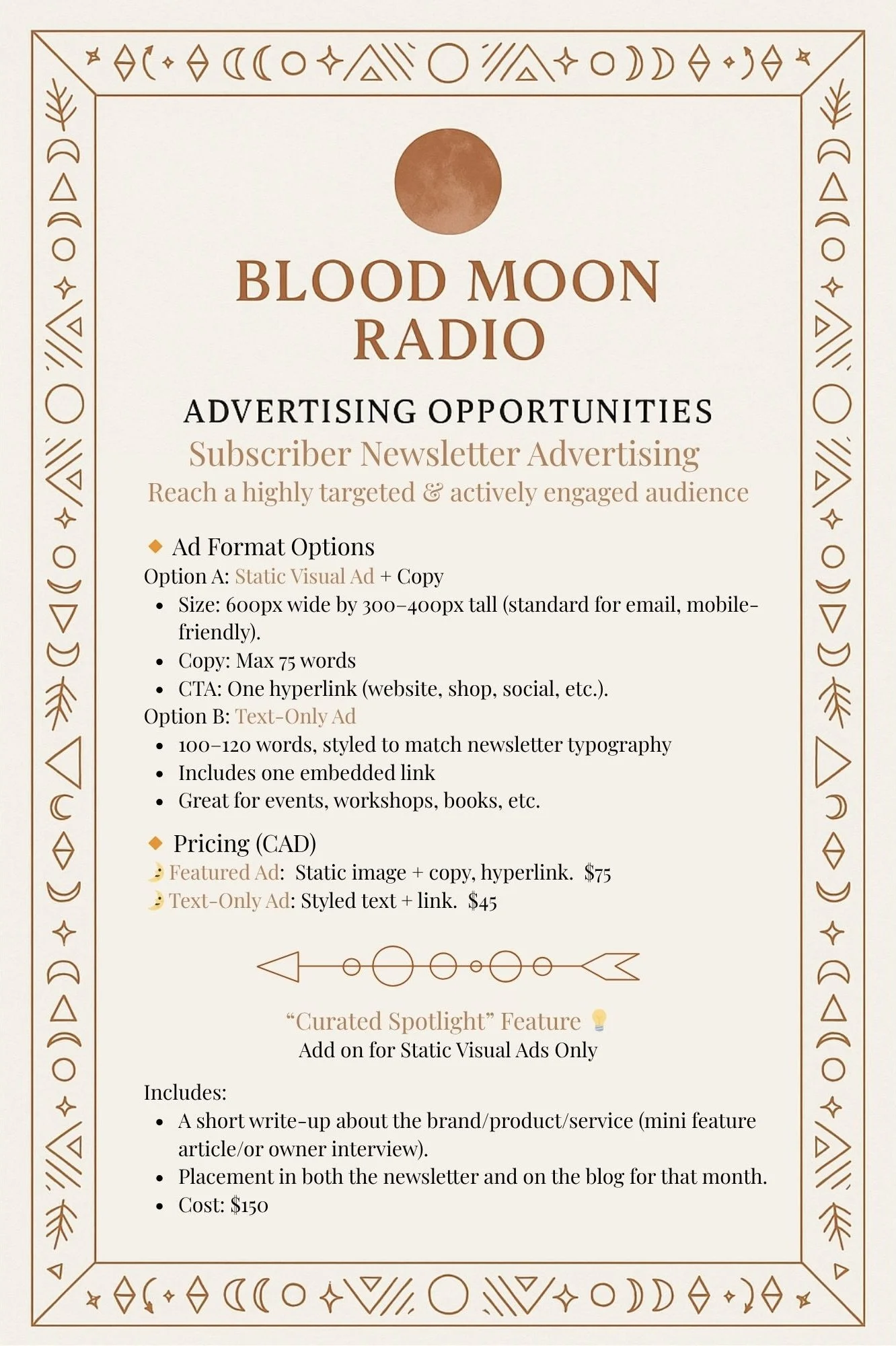 If you are interested in purchasing an ad, or want to discuss product features, events, content collaborations, and influencer-style promo either through the Blood Moon radio social channels, or host Coraley Letcher’s social channels, please reach out via the contact form.